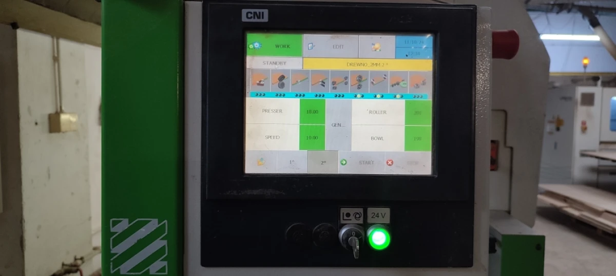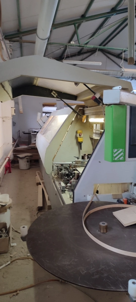 The Biesse Artech Akron 855 is a high-performance, single-sided edgebander engineered for continuous industrial applications. Manufactured in 2008, this machine combines a heavy-duty frame (3500 kg) with advanced CNI computerized control, ensuring high-precision finishing for various panel types. It is an ideal solution for medium-to-large woodworking shops looking for a reliable machine capable of high-volume production with features like corner rounding and pre-milling.