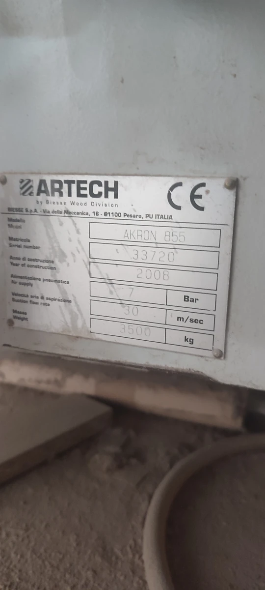 Q: Does the Akron 855 include a corner rounding unit? A: Yes, this specific 2008 Akron 855 model is equipped with a corner rounding unit for professional finishing of panel edges.