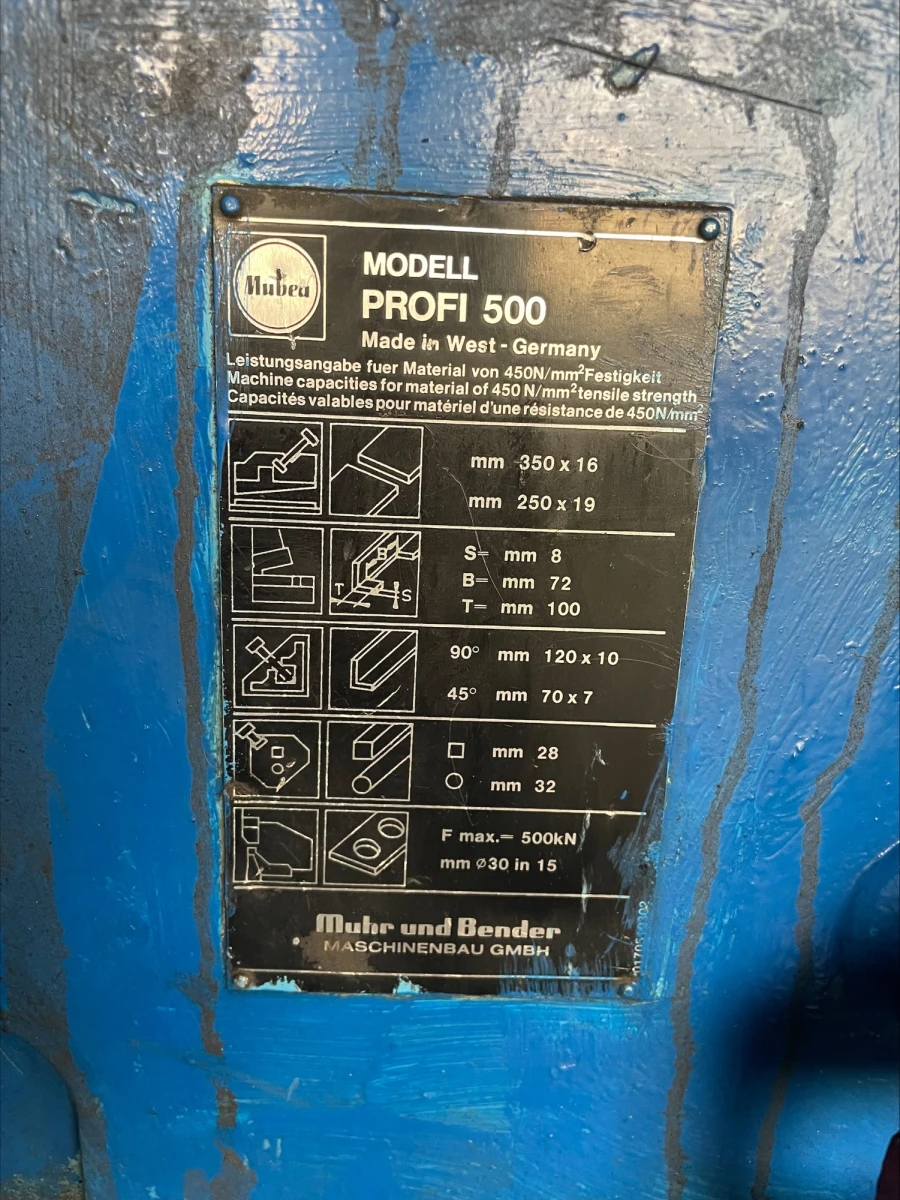 我们展示了来自著名制造商 Muhr und Bender (Mubea) 的液压多功能 ironworker 机器,型号为 PROFI 500. 它是一种多功能工业设备,结合了打孔机和型材及扁钢剪床的功能。. 该机器具有传奇般的德国精密工艺,可在最困难的车间条件下实现数十年的无故障运行。