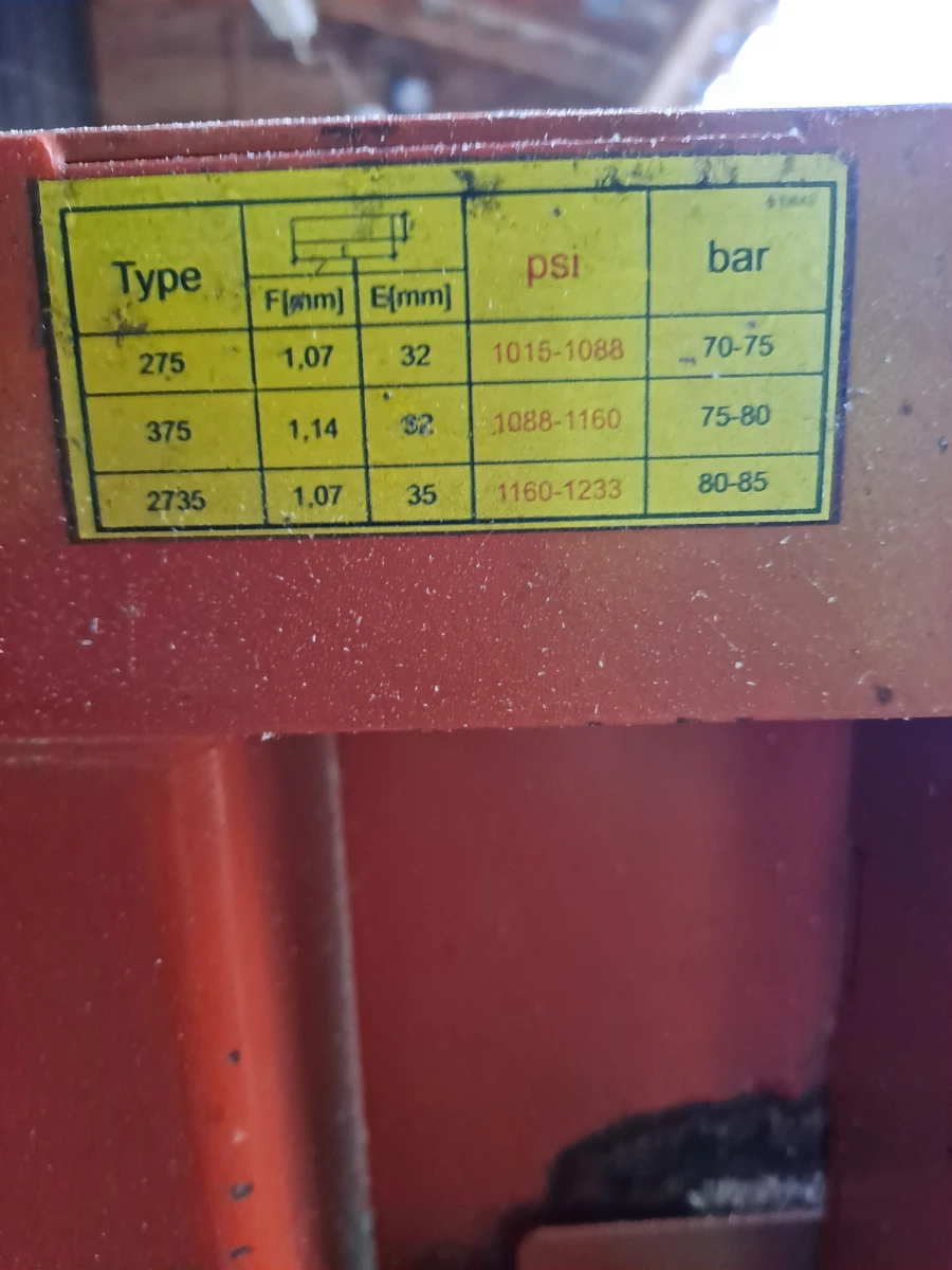 Blade TypeTooth Set (F)Thickness (E)Recommended Pressure (PSI / Bar)Type 2751.07 mm32 mm1015-1088 psi (70-75 bar)